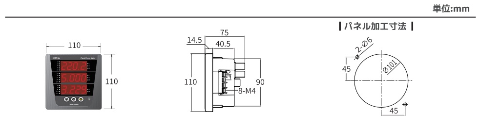 三相電圧、三相電流、W、PF、var、Hz、Wh、Varhを計測し、表示された計測値を RS-485 通信で遠隔監視が可能な機器です